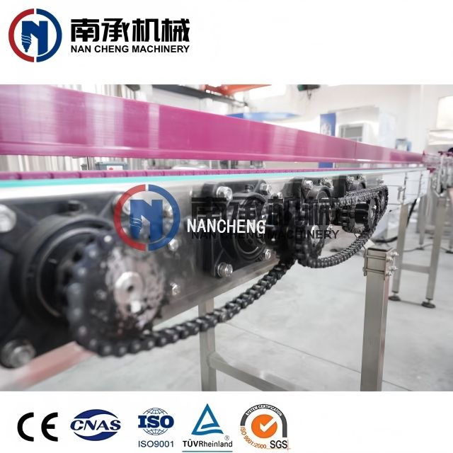 輸送系統(tǒng)配有潤滑裝置,螺旋電機(jī),高速磁鏈板,水板,整條線使用壽命更長,瓶子輸送速度更快更平穩(wěn)。
